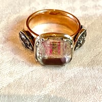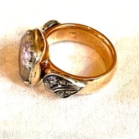 2) foiled pink crystal--14k rose gold with silver set rose cut diamond set leaves flanking a collet set foiled pink Stuart crystal heraldic motif. English c1680-1750 $3900. Size 6