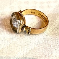 1) clear rock crystal--set in rose gold with two silver set rose cut diamonds, heraldic motif. Hand made c.1650-1700. $3300. Size 5