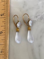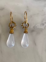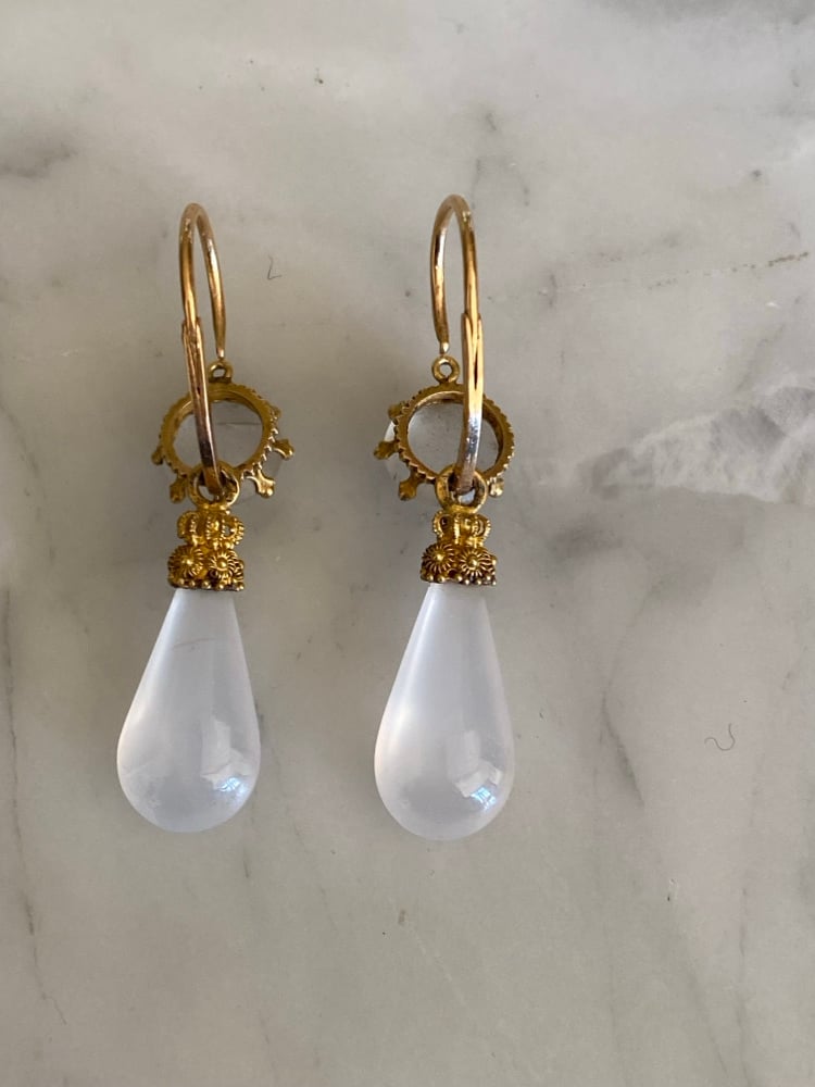 Chalcedony and rose gold drop style earrings. English c1820-30 Georgian era. These are "day and night" meaning you can take the drop off and just wear the top part "during the day" for a more casual look.