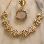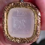 Natural chalcedony intaglio carved with a family crest which includes a horse at the top. Set in ornate gold over copper setting. English circa 1820.