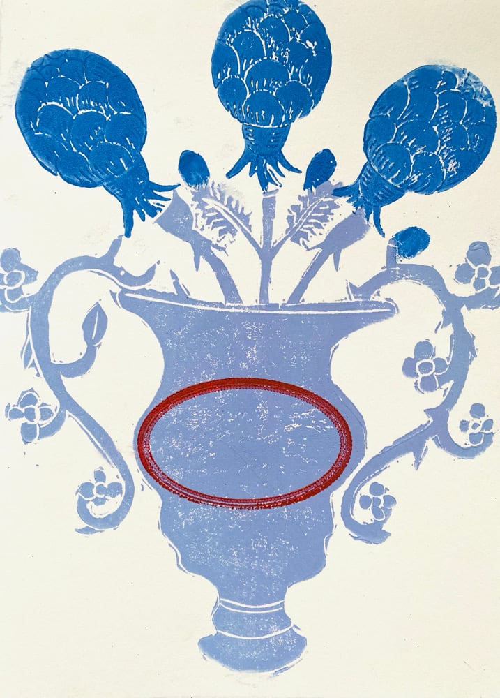 7 X 10 INCH FOLDED CARD HAND BLOCK PRINTED ON HEAVY ARTIST GRADE PAPER COMES WITH VELLUM ENVELOPE