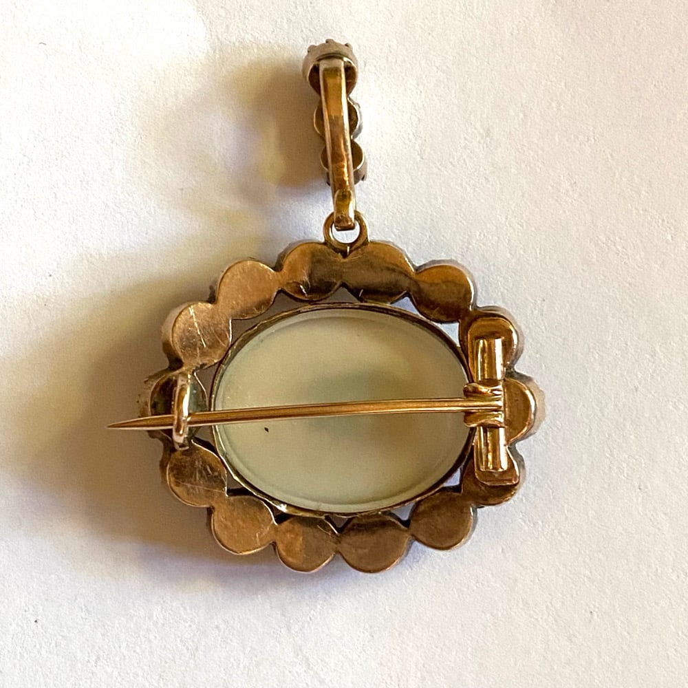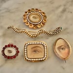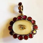 14-18k gold set with a hand painted lover's eye portrait surrounded by flat cut rhodalite garnets. The eye is a blue gentleman's eye. There is a locket on the back to hold a lock of hair or a momento. The bale is set with flat cut garnets as well. Very fine. English c. 1820