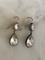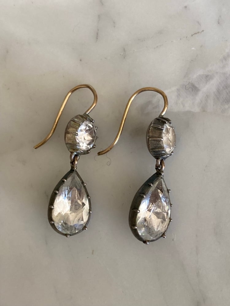 Faceted foiled paste set in silver drop style earrings. Gold wires may be newer. English Georgian era.