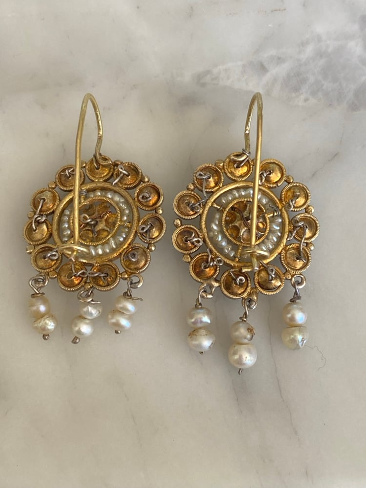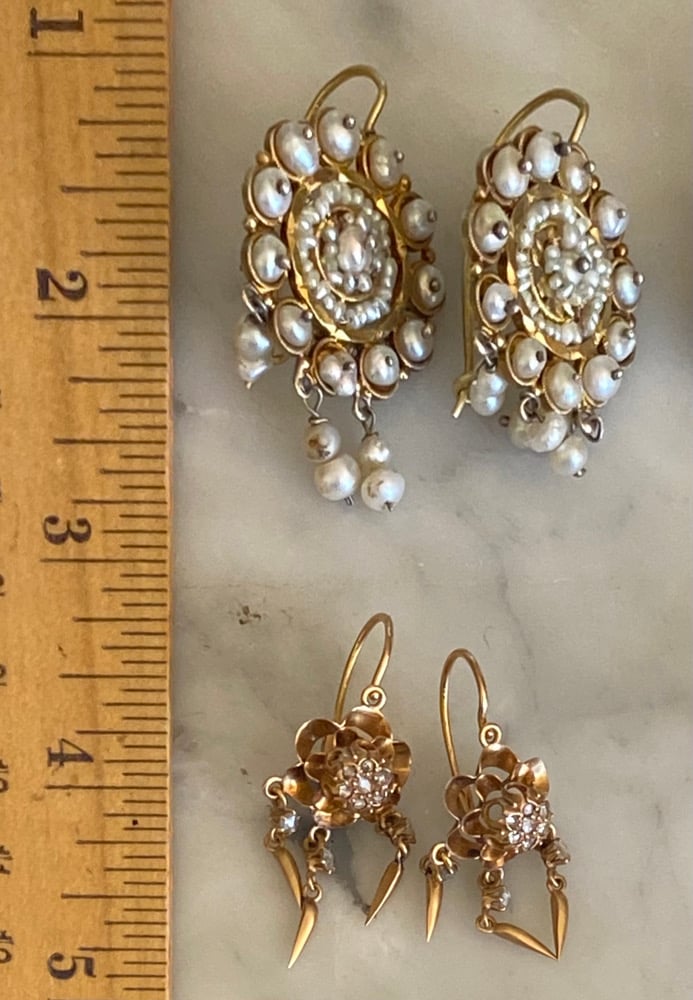 Beautiful old gold filigree set with pearls from Oaxaca. This particular style is more unusual than other Oaxacan styles.