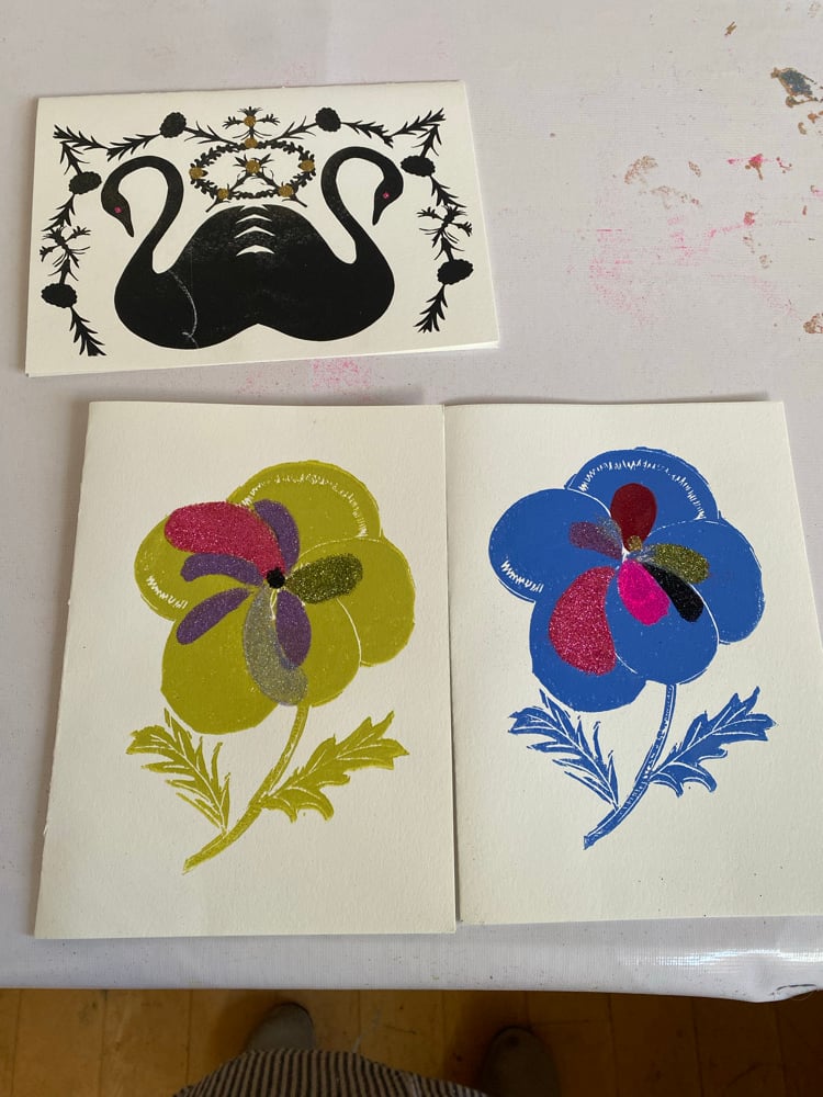 7x10 inch folded card on heavy artist grade paper with hand applied glitter. Comes with Vellum envelope.