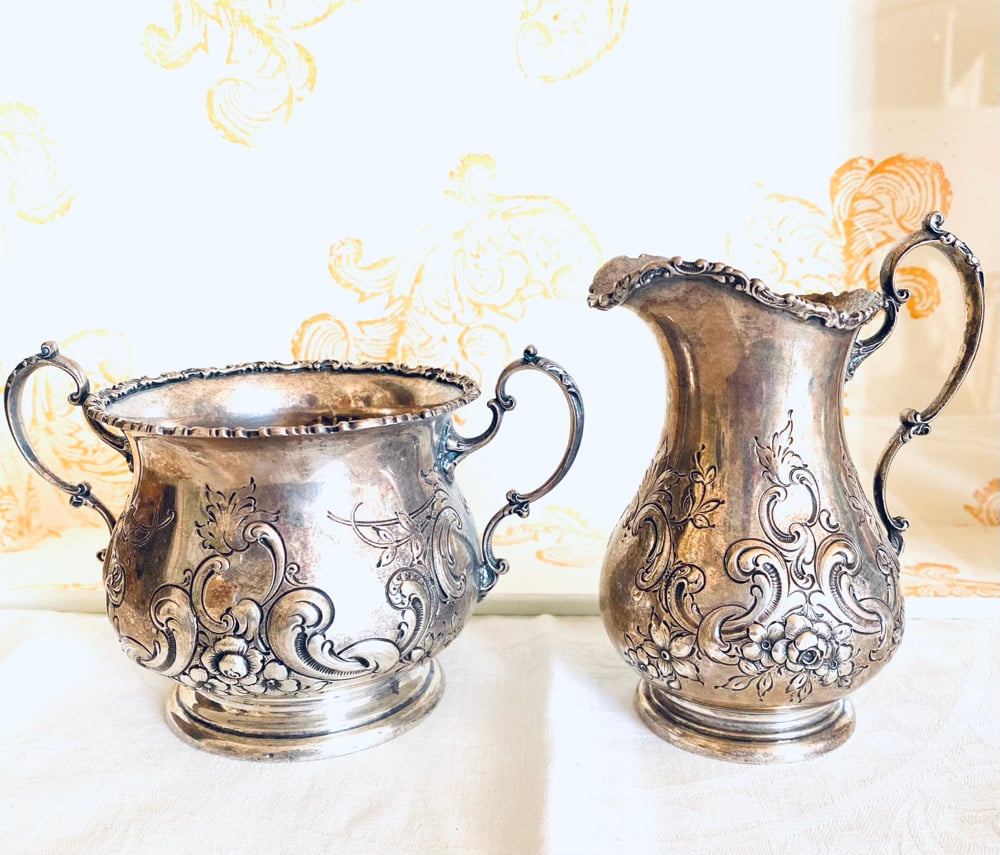 Set of sterling cream pitcher and sugar bowl both in need of a little polishing maybe. Pretty repousse and etching design by Barton and Eden or Eton and Barrow or some other English Austen sounding Victorian type name that's supposed to impress us--see photos.