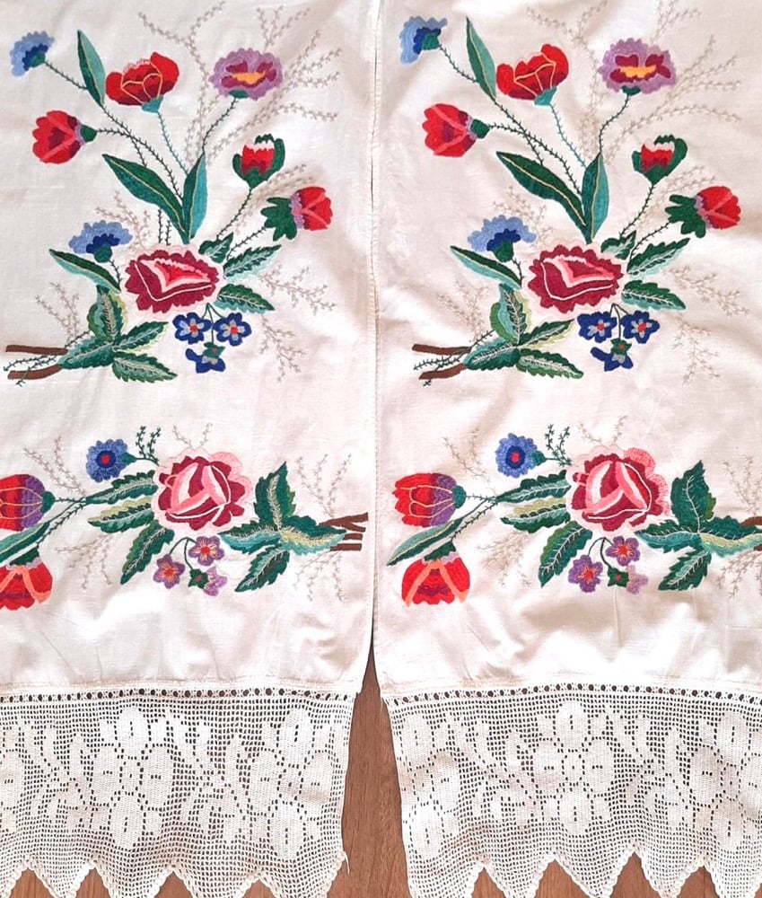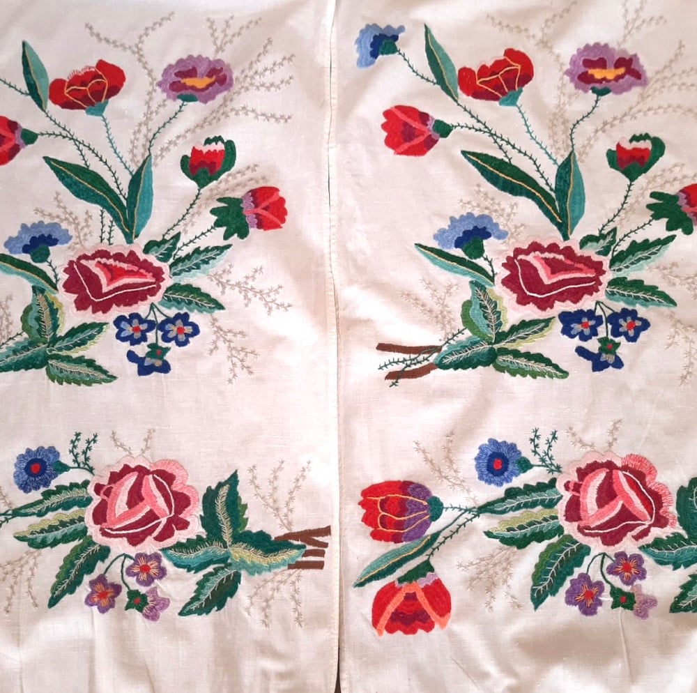 Hand embroidered on cotton in the mid 1900's the textiles were used a dowry pieces and are table runners. They also served multiple purposes as decoration or as aprons. This one is 111 inches by 14.35 inches. The center is plain-- the embroidery is at the two ends. There is some minimal signs of age.