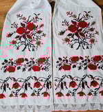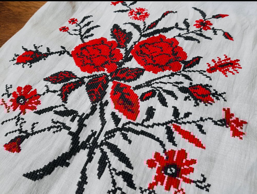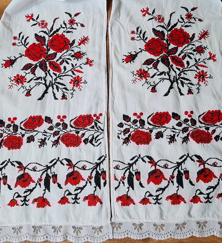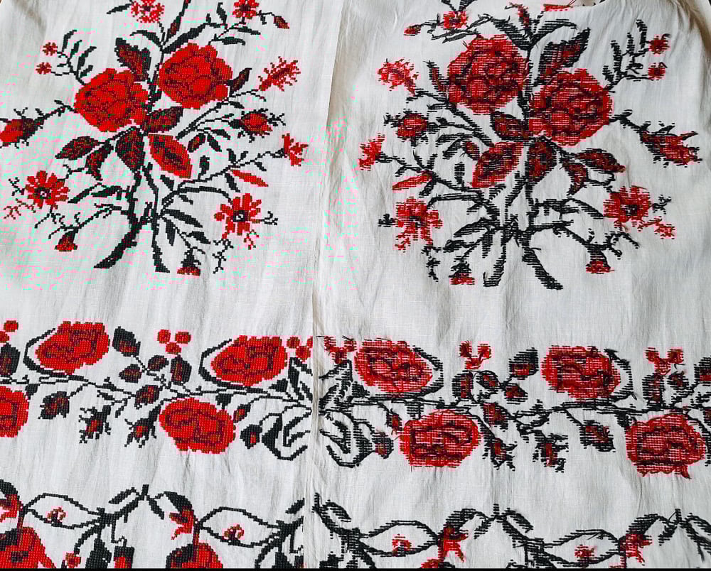 Hand embroidered on linen in the mid 1900's the textiles were used a dowry pieces and are table runners. They also served multiple purposes as decoration or as aprons. This one is 84 inches by 13.7 inches. The center is plain-- the embroidery is at the two ends. There is some minimal signs of age.