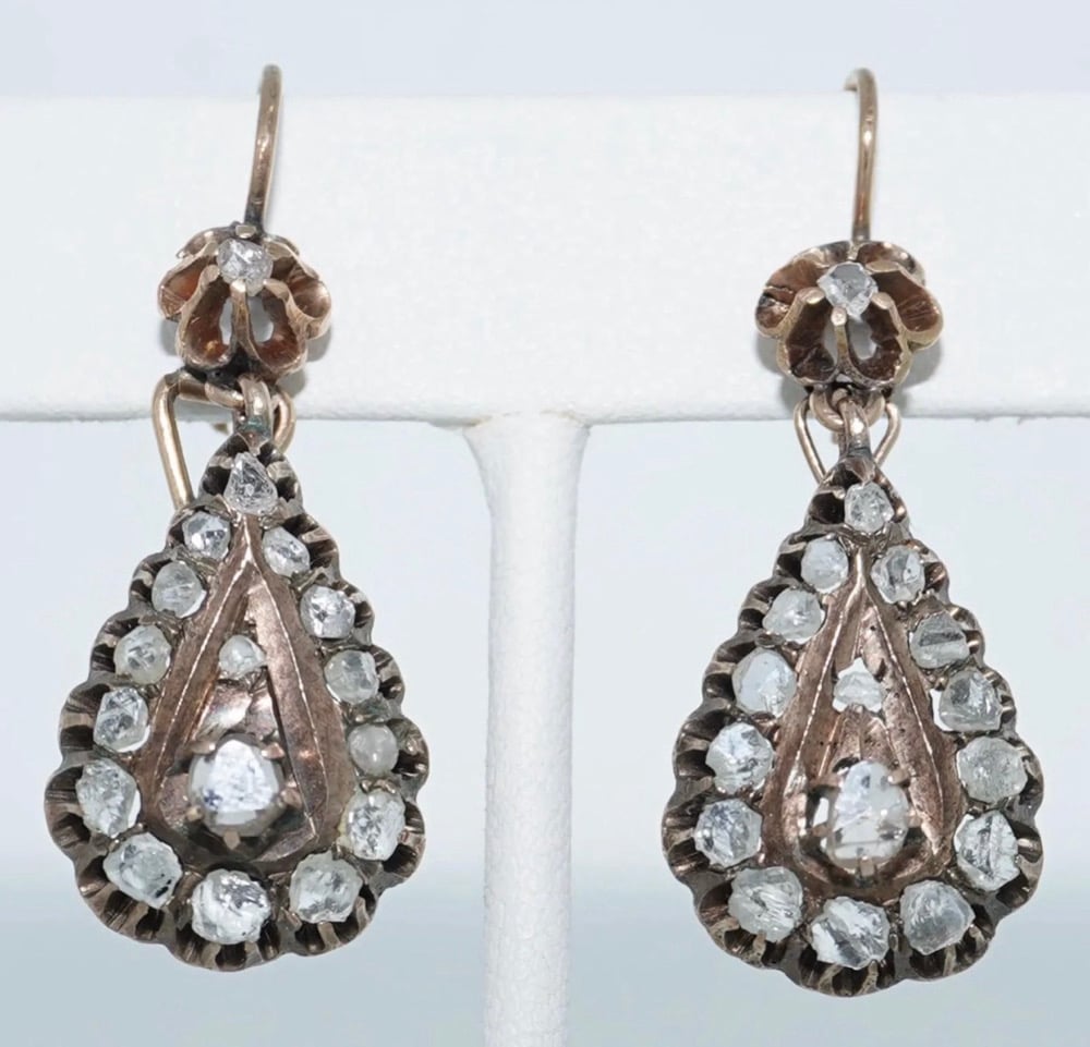 Rose gold 10-12k tear drop shape set with multiple mixed cuts of diamonds--mine cuts, rose cuts and European cuts. Mid European, Victorian era. Approximately 1.25 inches long.